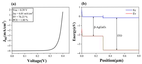 The work function assigned to the gold (Au) electrode is 5.1 eV. The photovoltaic performance was evaluated across three device configurations: (i) a structure without transport layers (ITO/β-AgGaO2/Au), (ii) a structure incorporating a hole transport layer (ITO/β-AgGaO2/HTL/Au), and (iii) a structure incorporating an electron transport layer (ITO/ETL/β-AgGaO2/Au).