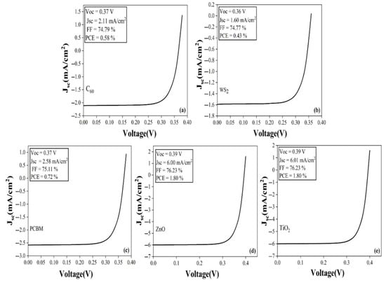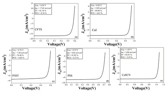 To evaluate the effect of the HTL on photovoltaic performance, materials such as CFTS, CuI, P3HT, PSS, and CuSCN were tested. J–V characteristics in Figure 6 show that the choice of HTL significantly impacts the device performance.