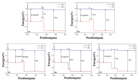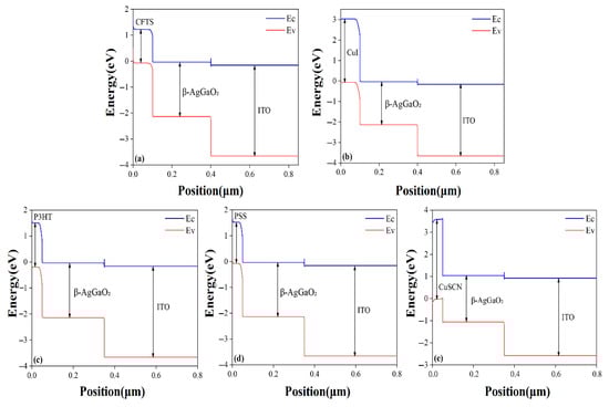 CFTS showed the best performance, with a Jsc of 17.05 mA/cm2 and a PCE of 8.10%, demonstrating excellent hole extraction and transport capabilities. According to previous reports, CFTS exhibits excellent thermal stability and could be compatible with low-temperature solution processing, making it a promising candidate for integration with oxide semiconductors in photovoltaic or photocatalytic applications []. However, due to the current lack of experimental studies on the direct interface formation between CFTS and β-AgGaO2, further investigations are needed to verify the interface quality and assess the feasibility of practical device fabrication. Although CuSCN exhibited the highest Voc (1.07 V), its Jsc was low (5.88 mA/cm2), resulting in a PCE of 5.39%, indicating that the interface energy barrier limits charge transport. P3HT and CuI showed lower PCEs (around 4.6%) due to lower Jsc and Voc values. PSS exhibited slightly better performance with a Jsc of 8.85 mA/cm2 and a PCE of 5.13%. The band diagram analysis in Figure 7 reveals that band alignment plays a critical role in performance.