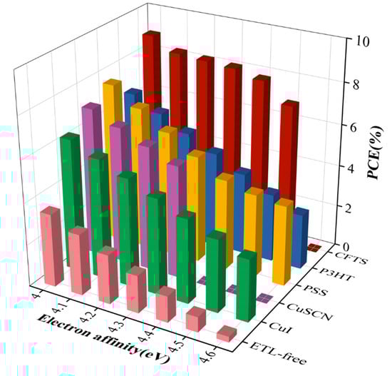 The band diagram further explains this phenomenon in Figure 5b: the conduction band (Ec) alignment between AgGaO2 and ITO facilitates effective electron extraction and transport. However, the poor valence band (Ev) alignment suppresses hole extraction, leading to enhanced interface recombination and hindered charge transport. Since the electron affinity was estimated using a semi-empirical formula, some degree of uncertainty may be present. To assess its influence, we varied the electron affinity from 4.0 eV to 4.6 eV in increments of 0.1 eV and recalculated the corresponding power conversion efficiencies (PCEs). As shown in Table 9, a decrease in electron affinity tends to improve band alignment. The results suggest that even small variations in electron affinity can cause noticeable changes in PCE, indicating the model’s sensitivity to this parameter. Accordingly, the use of experimental techniques such as UPS or XPS in future studies may help obtain more accurate band alignment data and improve the reliability of simulation results. The multi-point computational analysis presented here may serve as a useful reference for subsequent investigations.