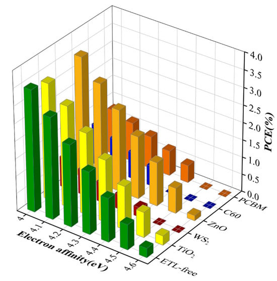Although the ETL is theoretically expected to improve performance, the devices using ETL materials such as C60, WS2, PCBM, ZnO, and TiO2 did not demonstrate better performance than those without transport layers in Figure 9.