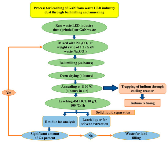 - Swain, B.; Mishra, C.; Kang, L.; Park, K.-S.; Lee, C.G.; Hong, H.S. Recycling process for recovery of gallium from GaN an e-waste of LED industry through ball milling, annealing and leaching. Environ. Res. 2015, 138, 401–408. [Google Scholar] [CrossRef]