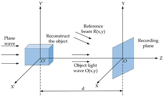 The measurement principle of digital holography follows the same basic concept as traditional optical holography, with the key difference being that digital holography utilizes an electronic imaging sensor instead of a traditional holographic plate to record a digital hologram. Figure 1 illustrates the optical path for recording a digital hologram. In this setup, X’0’Y’ represents the object plane, X0Y signifies the recording plane where the CCD photosensitive surface is located, and d indicates the recording distance of the digital holography system. When the object wave and reference wave are illuminated simultaneously, the hologram is captured by the CCD based on the principle of light interference, thereby achieving the digitalization of the hologram.
