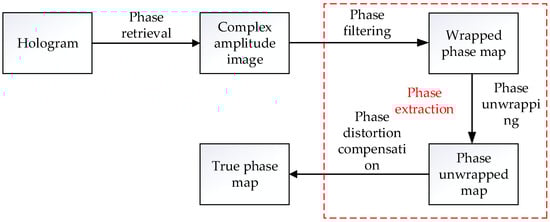 Figure 8 illustrates the process of phase extraction in DHM, which involves three key steps: phase filtering, phase unwrapping, and phase distortion compensation. The phase extraction process begins with phase retrieval to acquire the complex amplitude image. This image is then subjected to phase filtering to produce the wrapped phase map. Subsequently, phase unwrapping is performed on the wrapped phase map to generate the phase unwrapping map. Finally, phase distortion compensation is applied to the unwrapped phase map to obtain the final real phase information.