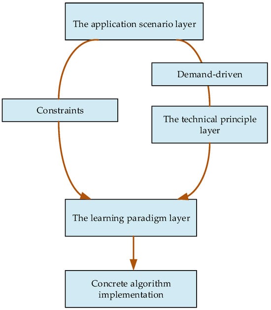 Figure 5 introduces a structured, three-layer classification framework designed to clarify how deep learning techniques are applied to DHM phase processing across three dimensions: the application scenario layer (e.g., biomedical, materials science), the technical principle layer (data-driven, model-driven, hybrid), and the learning paradigm layer (supervised, unsupervised, self-supervised learning).