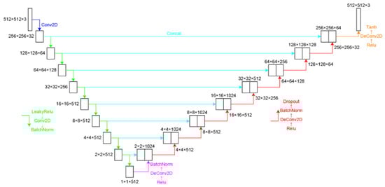 U-Net CNN model [19], where green line represents the combination of LeakyRelu + Conv2D + BatchNorm, pink line represents the combination of Relu + DeConv2D + BatchNorm, red line represents the combination of Relu + DeConv2D + BatchNorm + Dropout, and orange line represents the combination of Relu + DeConv2D + Tanh.