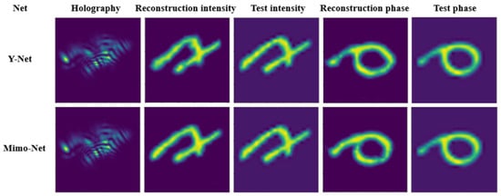 In 2023, Chen et al. from the North China University of Science and Technology proposed the Mimo-Net network [21], which requires only a single training session to simultaneously reconstruct intensity and phase information at three different scales. Compared to Y-Net [20], Mimo-Net offers superior reconstruction performance in terms of image quality. Figure 7 compares the reconstruction results of Mimo-Net and Y-Net at the same scale of 256 × 256.