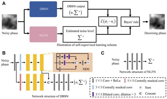 To address the issue (1), Wu et al. from Guangdong University of Technology proposed a network comprising a deep bilateral network (DBSN) and a non-local feature network (NLFN) in 2022 [30]. The framework of the DBSN and NLFN network is shown in Figure 9. The network is trained using a self-supervised loss function and outperforms traditional median filtering, block-matching, and 3D filtering in noise removal, providing superior noise suppression and generating noise-free phase maps.