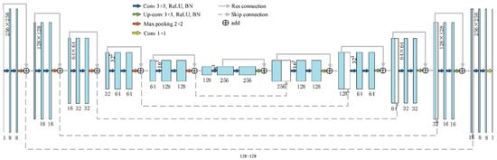 To address the issue (2), Yuki Nagahama from the Tokyo University of Agriculture and Technology introduced a phase retrieval method using a U-Net network model in 2022 [19]. Figure 6 depicts the U-Net CNN model. This approach can process a single hologram, significantly simplifying the process, effectively removing overlapping conjugate images, and enhancing the quality of reconstructed images. In terms of the evaluation metric mean absolute error (MAE), this method reduces the error by 0.058–0.069 π compared to traditional methods. However, comparisons of this method to other deep learning models were not provided.