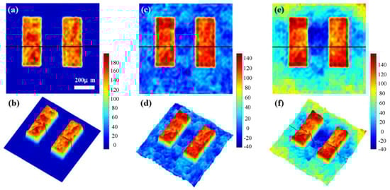 (a) Result obtained by the proposed method; (b) 3D rendering of (a). (c) Result obtained by BS+ZPF; (d) 3D rendering of (c). (e) Result obtained by ZPF; (f) 3D rendering of (e) [58].