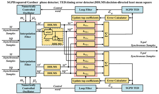 The asynchronously sampled FTN signals are first processed through CD compensation and then fed into a timing synchronization loop embedded with a two-stage Rx IQ imbalance compensation module, which comprises a DDLMS algorithm and a BTD 4 × 2 equalizer. First, the DDLMS equalizer performs preliminary ISI equalization on the CD-compensated asynchronous samples to mitigate the severe ISI distortions caused by the FTN shaping filter, thereby reducing their adverse impact on the subsequent second-stage Rx IQ imbalance compensation. This is because sample clock errors and Rx IQ imbalance impairments interact with each other, resulting in the limited performance of the DDLMS algorithm in equalizing ISI. Subsequently, the BTD 4 × 2 equalizer monitors and compensates for Rx IQ imbalance while simultaneously achieving polarization demultiplexing and adaptive equalization. The output of the BTD 4 × 2 equalizer is given by Equation (3).