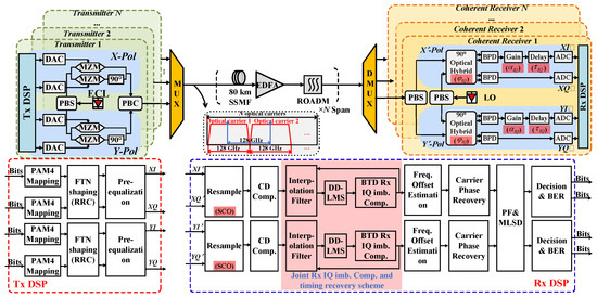 As illustrated in Figure 2, a 128 Gbaud PM 16-QAM FTN-WDM coherent optical transmission system was constructed using VPI and Optilux to validate the performance of the proposed scheme. In the simulation platform, the Rx IQ imbalance and sample clock offset (SCO) impairments were introduced as follows: Rx IQ amplitude imbalance was generated by applying unequal amplification to the electrical signals of the I components in the X-polarization and Y-polarization. Rx IQ skew was introduced by applying time delays to the XI and YI signals, while Rx IQ phase imbalance was emulated using a 90° optical hybrid. Additionally, since the VPI 9.9 simulation software could not introduce SCO impairment, this impairment was incorporated through a resampling algorithm in the Rx DSP.