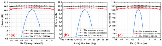The simulation result of Q factor with Rx IQ imbalance under 0.9 AF. (a) Rx Amp. Imb., (b) Rx Phase Imb., (c) Rx IQ skew.