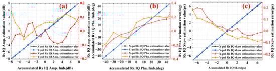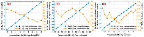 The simulation estimation accuracy of Rx IQ imbalance under 0.9 AF. (a) Rx Amp. Imb., (b) Rx Phase Imb., (c) Rx IQ skew.