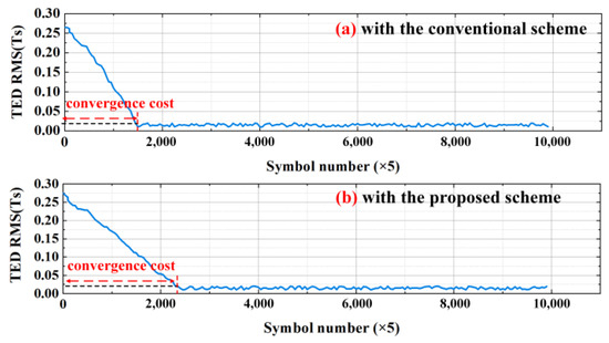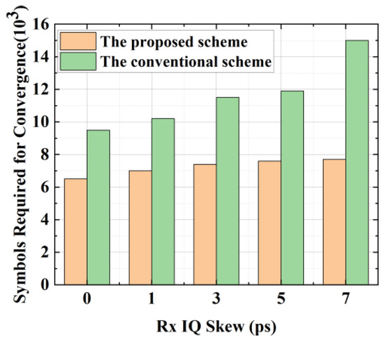 As shown in Figure 6, the convergence costs required to establish the timing synchronization loop using the proposed scheme and the conventional BFD scheme under the condition of different Rx IQ skew are compared. The specific simulation conditions are SCO of 200 ppm, transmission of 240 km, and amplitude imbalance and phase imbalance of 2 dB and 20 deg, respectively. The convergence cost required for the establishment of the timing synchronization loop in Figure 6 is determined by averaging the convergence cost after multiple simulations, where RMS values stabilize in less than 0.02 Ts. The simulation results show that in the [0, 5] ps range, where both schemes work stably, the convergence cost of the conventional BFD scheme increases faster with the increase in Rx IQ skew than that of the proposed scheme. This is because, compared with the conventional BFD scheme, the proposed scheme could balance part of the ISI impairment before compensating for the Rx IQ imbalance, so it has a better IQ imbalance compensation effect, which reduces the impact of IQ imbalance, ISI, DGD, and other impairments before timing error calculation. In addition, in the IQ skew range where both schemes work stably, the proposed scheme could reduce the convergence cost by at least 31% compared with the conventional BFD scheme. When the receiver IQ skew is 7 ps, the convergence cost of the proposed scheme is about 50% lower than that of the conventional BFD scheme because it is difficult to stably compensate for the Rx IQ skew.