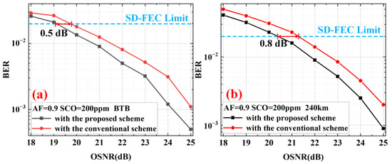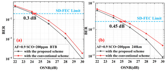 The OSNR vs. BER curve under 0.9 AF. (a) BTB; (b) 240 km.