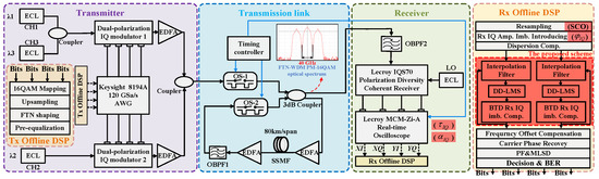 Performance evaluation of the proposed scheme employed 40 GBaud PM-16QAM FTN-WDM experiments. The transmitter’s offline DSP implemented FTN shaping via a root-raised cosine (RRC) filter (manufactured by Finisar Corporation (subsidiary in Wuxi, China), and laboratory instruments were procured from Finisar China). Discrete samples underwent pre-equalization post-shaping to mitigate high-frequency impairment before being fed into an Agilent 8194A arbitrary waveform generator (AWG) (produced by Agilent Technologies (headquartered in Santa Clara, CA, USA), with the laboratory unit purchased through Keysight Distributor (China)). Operating at 120 Gsample/s with ∼45 GHz −3 dB bandwidth, the AWG synchronized four channels. Three-fold oversampling generated 40 GBaud electrical signals. Three tunable external cavity lasers (ECLs), emitting carriers at ∼50 kHz linewidth and spaced at 40 GHz around 193.414 THz, were partitioned into odd/even channel groups. These drove dual-polarization IQ modulators (modulator 1 and 2) (originated from Rayley Corporation (Shenzhen, China), and the laboratory modulator was acquired domestically in China) with AWG-generated I/Q electrical signals. Modulated carriers entered a recirculating fiber loop comprising optical couplers, optical switch (OS), optical bandpass filter (OBPF), and 80 km G.652D SSMF spans (0.17 dB/km attenuation, 0.2 ps/km1/2 PMD) with EDFA amplification. OBPF1 completes the out-of-band noise filtering for each span, while launch power was maintained at 4 dBm to suppress nonlinearities. After fiber loop transmission, PM-16QAM FTN signals are passed through an OBPF2. A Lecroy 10Zi-A real-time oscilloscope (80 Gsample/s, 30 GHz −3 dB bandwidth) (manufactured by Teledyne LeCroy (Chestnut Ridge, NY, USA), with the laboratory device sourced via Keysight Distributor (China)) sampled the PM-16QAM FTN waveforms for offline processing. Receiver DSP sequentially executed: resampling, chromatic dispersion compensation, the joint compensation scheme, frequency offset correction, carrier phase recovery, post-filter with maximum-likelihood sequence detection (PF-MLSD), and BER calculation.