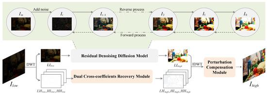 Retinex theory suggests that image formation is governed by both the illumination and reflectance components. In mathematical terms, a low-light image can be expressed as the product of the illumination map and the reflectance image R, . A normal-light image can also be represented as the product of the illumination map and the reflectance image R, . The network model N can be described as achieving: . However, in practical scenarios, low-light images are often affected by noise and artifacts [9], leading to the actual situation , where represents the perturbation of the illumination component and represents the perturbation of the reflection component. Therefore, the aforementioned methods, including DWT, the residual diffusion model, and DCRM, can be described in practical testing as a model N and achieve: