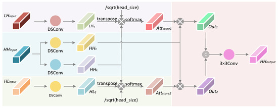 As shown in Figure 3, the DCRM takes the concatenated three high-frequency coefficients (, , ) as input. These coefficients first pass through a feature extractor consisting of two sets of Depth-wise Separable Convolution (DSConv) [36] layers and ELU [37] activation layers. Each set includes one DSConv layer, which expands the input from 3 channels to 64 channels, followed by an ELU activation layer. This process results in a 64-channel feature representation for each coefficient. Subsequently, we employ Dual Cross-Attention (DCA) to enrich the details of the coefficient using information from the and coefficients, as illustrated in Figure 4. Simultaneously, two self-attention layers are applied to further capture and refine the characteristics of the and coefficients. Additionally, drawing from the research of [38], we introduce a progressive spatial dilated Resblock, which facilitates local restoration through dilated convolutions. In this structure, the initial and final convolutional layers focus on extracting local information, while the intermediate dilated convolutional layers capture a broader context by increasing the receptive field. This approach effectively avoids the grid effect that typically results from using a fixed dilation rate. Finally, a DSConv layer reduces the number of channels to complete the reconstruction of the three coefficients.