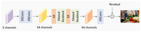 where C is a perturbation influence term. To compensate for C, we designed a perturbation compensation module (PCM), as shown in Figure 5, which adopts self-attention layers and dilated Resblock from DCRM, pruning unnecessary network structures, and is specifically used for predicting perturbations in a single image. By compensating the network’s predicted results into the IDWT results, we obtain the final enhanced low-light image.