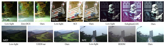- Li, Z.; Zhang, F.; Cao, M.; Zhang, J.; Shao, Y.; Wang, Y.; Sang, N. Real-time exposure correction via collaborative transformations and adaptive sampling. In Proceedings of the of the IEEE/CVF Conference on Computer Vision and Pattern Recognition, Seattle, WA, USA, 17–21 June 2024; pp. 2984–2994. [Google Scholar]