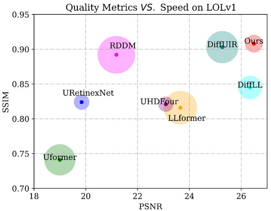 Comparison with SOTA methods on LOLv1 dataset in terms of PSNR and SSIM. Circle sizes indicate the inference time.