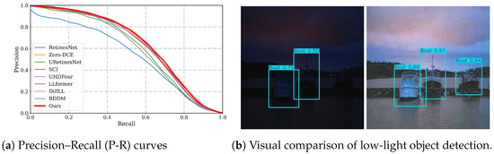 To assess the influence of different image enhancement techniques on high-level visual tasks, we performed low-light object detection experiments using the ExDark dataset [52]. The ExDark dataset consists of 7363 underexposed images, each annotated with bounding boxes for 12 object categories. We excluded images without three channels, resulting in 5841 images for training and 1422 for testing. For object detection, we employed YOLOv11 [53], and trained it from scratch. Various low-light enhancement algorithms were used as fixed-parameter preprocessing steps. Figure 10a presents the Precision–Recall (P-R) curves for all categories, while Table 5 lists the Average Precision (AP@50:95) scores for each category. Our method achieved the highest mean Average Precision (mAP@50:95) of 0.410, outperforming the most recent supervised method, LLformer, by 0.01 and the most recent unsupervised method, SCI, by 0.012. Notably, our method performed best in five specific categories: boats, bottles, buses, motorcycles, and tables. Figure 10b provides a visual comparison of detection results in low-light conditions (left) versus after LightenResDiff enhancement (right). In the original low-light scenes, detectors tend to miss some boats or make inaccurate predictions due to underexposure. However, when using images enhanced by our LightenResDiff method, the detector operates more reliably, accurately predicting well-placed bounding boxes that cover all boats. This demonstrates the effectiveness of our method in enhancing the performance of high-level visual tasks.