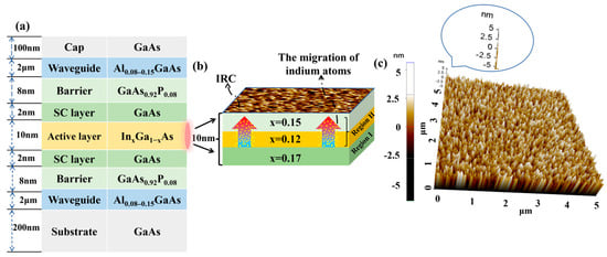 Initially, the growth mode of the In0.17Ga0.83As region follows an ideal two-dimensional (2D) pattern within several monomolecular layers due to minimal strain accumulation. The indium content of x = 0.17 remains fixed (Region Ⅰ in Figure 1b). However, as the thickness of the In0.17Ga0.83As layer exceeds a critical value, accumulated strain reaches a threshold, inducing the upward migration of indium atoms to release stress and generate an island-like appearance. Meanwhile, the migration of indium atoms leads to the reduction of indium contents in the corresponding In0.17Ga0.83As quantum well layer and formation of indium-reduced InxGa1−xAs region (Region Ⅱ in Figure 1b). The formation mechanism produces a distinctive WIC active region containing both areas with indium-normal In0.17Ga0.83As and indium-reduced InxGa1−xAs regions. Additionally, the three-dimensional morphology of the InGaAs surface is observed using an atomic force microscope (AFM). The measurement results, as shown in Figure 1c, indicate that the sizes and distribution of indium-rich clusters are generally random, which leads to significant lateral inhomogeneity in indium distribution [18]. The size of the IRCs can be evaluated as 50–200 nm in width and 2–8 nm in height, respectively. For simplicity, they can be roughly grouped into two size ranges: around 150 nm and 50 nm. The local indium content (x) in the InGaAs material decreases from the original x = 0.17 to two lower levels: x = 0.12 and 0.15 (Region Ⅱ in Figure 1b) [7]. This is because the degree of indium atom migration is gradually weakened with the gradual release of stress, and the indium content begins to recover.