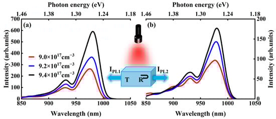 To measure and calculate the carrier inversion factor Pf of the InGaAs/GaAs WIC quantum-confined laser structure, we established an experimental setup to collect the photoluminescence (PL) spectra from the dual facets of the WIC sample, as illustrated in Figure 2. One facet of the sample was coated with an anti-reflectance coating (transmittance T = 99.99%) to eliminate intra-cavity light feedback, while the other facet remained uncoated, with a reflectance R. The epitaxial device was processed in an edge-emitting configuration with an area of 1.5 mm × 3 mm, which was optically pumped by an 808 nm fiber-coupled semiconductor laser with a pulse width of 20 ms (a product of Beijing Laserwave Optoelectronics Technology Co., Ltd. (Beijing, China), Model LWIRL808-40W-F). The PL spectra IPL1 (left) from the coated facet of the device and IPL2 (right) from the uncoated facet are collected by a spectrometer (Ocean Optics Inc. (Dunedin, FL, USA), model HR4000CG-UV-NIR), as shown in Figure 2, where the carrier densities are 9.0 × 1017 (red), 9.2 × 1017 (blue), and 9.4 × 1017 (black) cm−3. The carrier density N can be calculated from the pump power PP by using the following equation [19]: