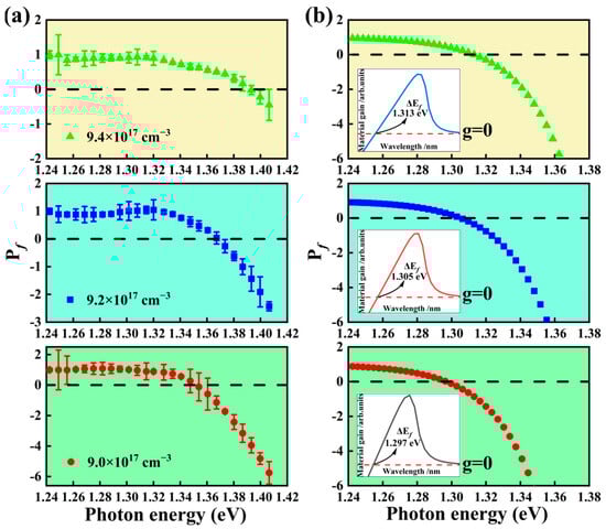 where ΔEf is the quasi-Fermi level separation between electrons and holes, KB is the Boltzmann constant, and T is the temperature. The value of ΔEf was determined by simulated material gain spectra (illustration in Figure 3b) by identifying the photon energy at which the material gain g = 0 (transparency point). Therefore, the Pf of the classical QW structure is shown in Figure 3b under similar carrier densities with the corresponding ΔEf of 1.297 eV, 1.305 eV, and 1.313 eV.