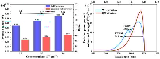 The experimental data for Pf in Figure 3a are unity at low photon energy, corresponding to complete population inversion (f1(E1) = 1, f2(E2) = 0). Regions exhibiting Pf > 0 correspond to the condition where f1(E1) > f2(E2), enabling efficient stimulated emission. Consequently, the energy separation Ehv = E1 − E2 matching the zero-crossing point (Pf = 0) fails to produce effective radiative recombination. This is because E1 and E2 cannot be effectively filled by electrons and holes. Therefore, the energy separation at Pf = 0 can be used to estimate the carrier-filling level. In Figure 3, when the carrier density increases from 9.0 × 1017 to 9.4 × 1017 cm−3 (4% increase), the band-filling level of the WIC structure increases from 1.352 to 1.392 eV (3.0% enhancement), while that of the classical QW structure increases from 1.297 to 1.313 eV (1.2% enhancement), indicating that WIC structure has higher carrier-filling capacity. Furthermore, compared to classical QW structures, the WIC structure can maintain Pf > 0 at the high-energy side, primarily due to the indium-reduced InGaAs regions, which exhibit the wide band gaps and create the localized high-energy quantum wells. It significantly enhances the probability of carriers occupying high-energy states, enabling effective carrier inversion at the high-energy side. To further investigate the carrier’s degree of inversion, the energy range of carrier inversion distribution (left vertical axis) with Pf > 0 between the special WIC structure and classical QW structure is presented in Figure 4a based on Figure 3. Specifically, the photon energy corresponding to Pf = 0 is first identified from Figure 3, followed by the photon energy 1.24 eV for Pf = 1. The difference between these two energy values is taken as the inversion range shown in Figure 4a. Besides, the ratio (right vertical axis) was also obtained by comparing the inversion ranges between the WIC and QW structures.