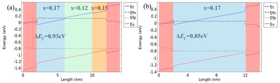 Figure 4a clearly shows that the inversion range (0.11, 0.13, and 0.15 eV) of the WIC structure (blue, experimental results) exhibits a broader value compared to that (0.05, 0.06, and 0.07 eV) of the classical QW structure (red, simulation results) under the carrier concentrations of 9.0 × 1017, 9.2 × 1017, and 9.4 × 1017 cm−3. The carrier’s degree of inversion in the WIC structure is up to 2.2 times larger than that of the classical QW structure. This indicates a significant increase in the probability of carriers occupying the upper state. Consequently, the WIC structure achieves higher carrier band-filling levels, which leads to the wide spectral bandwidth compared to classical quantum well (QW) structures. For a more comprehensive comparison, the simulated spectra from both WIC and QW structures are shown in Figure 4b. The WIC structure is established by COMSOL Multiphysics software (v6.1), with 4-nm-thick In0.17Ga0.83As, 4-nm-thick In0.12Ga0.88As, and 2-nm-thick In0.15Ga0.85As materials as the active layer, GaAs material as the strain compensation layer of 2 nm thickness, and GaAsP0.08 material with 8 nm thickness as the barrier material. For the QW structure, all layer parameters are identical to those of the WIC structure, except that the active layer consists of 10-nm-thick In0.17Ga0.83As. The results demonstrate that the classical 10-nm In0.17Ga0.83As QW exhibits a single spectral peak with a bandwidth of 42.8 nm, whereas the WIC structure shows two distinct peaks with a broadened bandwidth of 74.8 nm. The WIC structure exhibits higher spectral intensity in the short-wavelength region, indicating that carriers are easier to occupy high-energy levels, resulting in an enhanced Pf. This significantly enhances radiation recombination efficiency in the high-energy side, which is in agreement with our experimental results. This phenomenon is primarily attributed to the coexistence of normal and indium-reduced InxGa1−xAs regions, resulting from the strain-induced migration of indium atoms. The indium-reduced InxGa1−xAs regions, with larger band gaps, make it easier for carriers to occupy the high-energy levels, thereby increasing carrier inversion and band-filling levels, which can greatly expand the spectral bandwidth. To better demonstrate the WIC structure’s advantages in carrier inversion distribution and spectral characteristics, Figure 5 presents theoretically calculated energy band structures for both WIC and QW designs, simulated using COMSOL Multiphysics’ Semiconductor Module with a 2D steady-state drift-diffusion model that incorporates carrier transport, self-consistent potential distribution, and heterojunction boundary conditions. The migration of indium atoms induces nonuniform distributions of indium contents along both the growth and the horizontal directions. This complex distribution feature cannot be precisely represented in band diagrams. Therefore, Figure 5a presents a simplified band model, which simplifies a large number of discrete regions into three regions along the growth direction: In0.17Ga0.83As, In0.12Ga0.88As, and In0.15Ga0.85As to reveal the enhancement mechanism of the carrier inversion factor.