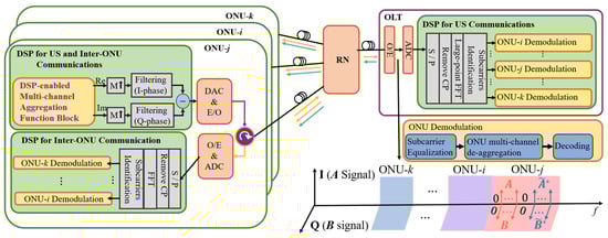 A schematic diagram of the concurrent direct inter-ONU and upstream communication IMDD PONs is illustrated in Figure 1, and the modified RN architecture is shown in Figure 2. The DSP-enabled multi-channel aggregation/de-aggregation process is presented in Section 2.2.