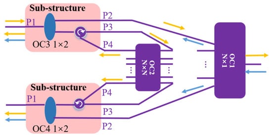 At the RN, as seen in Figure 2, the optical signals from various ONUs are launched in a corresponding sub-structure via the P1 port, where the optical signal is passively split into two copies: one sent to the OLT via the P2 port and OC-1 and the other redirected and broadcast to all the ONUs via the P3 port, OC-2, and the P4 port of the other sub-structure. Detailed RN operating principles can be found in []. According to the theoretical analyses in [], for PONs with total numbers of ONU of N = 8, 16, 32, 64, and 128, the resulting inter-ONU power losses are 18.75, 22.03, 25.33, 29.5, and 32.65 dB, respectively. Compared to the conventional OC-based inter-ONU communication PON RN designs (inter-ONU signals pass a 3-by-N OC twice) [,,], the modified RN can reduce inter-ONU signal power losses by approximately 2.75, 6.03, 9.33, 13.5, and 16.65 dB, respectively [], as experimentally verified in Section 4.1.
