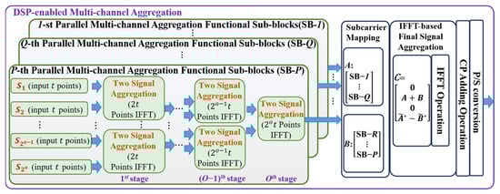 Taking the P-th sub-block as an example, the sub-block has O stages of parallel IFFT-based two-signal aggregation operations to aggregate 2O channels. Assuming each channel has t input samples, which can be encoded by arbitrary modulation formats including quadrature amplitude modulation (QAM) and phase shift keying (PSK), each two-signal aggregation operation implemented at the i-th stage can be expressed as