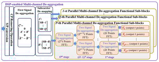 where and are the received C1 and C2 signals. After subcarrier de-mapping, the received samples are launched into their corresponding parallel multi-channel de-aggregation sub-blocks. Taking the P-th sub-block as an example again, it contains O stages of multiple parallel FFT-based two-signal de-aggregation operations. For the i-th stage, each two-signal de-aggregation first implements a 2w-point FFT operation and then separates the aggregated two signals following a formula expressed as follows: