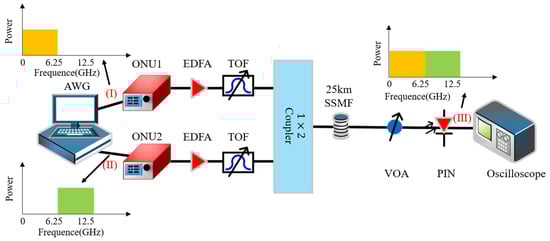 Two optical transmitters, each with a laser and a Mach–Zehnder modulator (MZM), are used to perform intensity modulation. The two optical signals produced have a ~0.8 nm wavelength spacing to eliminate the optical beating interference effect. After that, for each ONU, an erbium-doped fiber amplifier (EDFA) and a tunable optical filter (TOF) are used to set the ONU launch power at 5 dBm.