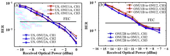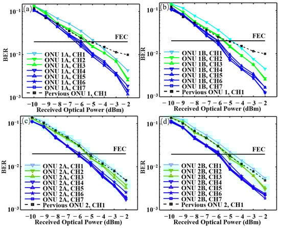 Based on the experimental setup shown in Figure 5, the upstream transmission performances of the two considered transceivers are presented in Figure 6. Adaptive bit-loading was used to ensure that all the channels conveyed by these two transceivers have similar upstream receiver sensitivities, i.e., the minimum received optical powers required to achieve bit error rates (BERs) of 2 × 10−2 at the forward error correction (FEC) limit []. For the previously reported P2MP transceivers, since all the channels exhibit similar BER performances, for simplicity, only the BER performance of CH1 is plotted in these figures.