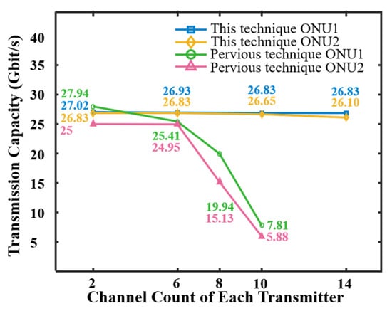 It can be found from Figure 7 that for the previously reported P2MP transceivers, increasing the channel count to >8 leads to a considerable reduction in the maximum achievable aggregated upstream transmission capacity. This agrees with the result in []. This is because an increase in channel count leads to more pronounced channel interference []. While for the new P2MP transceivers, increasing the channel count to 14 can only cause a <0.7% reduction in the aggregated upstream transmission capacities. This implies that the new P2MP transceivers can support more channels with highly robust transmission performances, as also suggested by the results in Section 4.3.