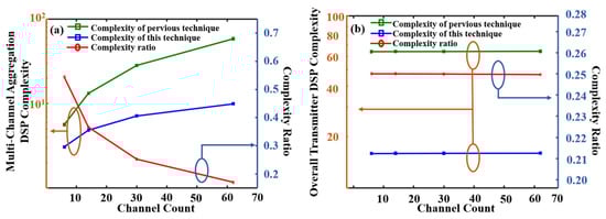 (a) Transmitter multi-channel aggregation DSP complexity (excluding digital filter DSP complexity); (b) overall transmitter DSP complexity, including both multi-channel aggregation and digital filter DSP complexities.
