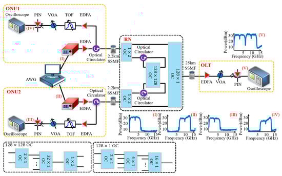 To experimentally evaluate the concurrent direct inter-ONU and upstream communication IMDD PON incorporating the new P2MP transceivers and the modified RNs, in this section, a 27 km, >54.31 Gbit/s upstream IMDD PON is considered, as shown in Figure 9. As shown in the figure, the RN is constructed by 128-port OCs, suggesting that the PON can accommodate 128 ONUs. Due to the lack of key experimental devices, for simplicity, these 128-port OCs are constructed using multiple OCs. For the experimental setup, the ONU optical launch power is 6.6 dBm, while all other key experiment parameters, including the AWG/oscilloscope sampling speed and the MZM/laser/EGF filter parameters, are similar to those listed in Table 1.