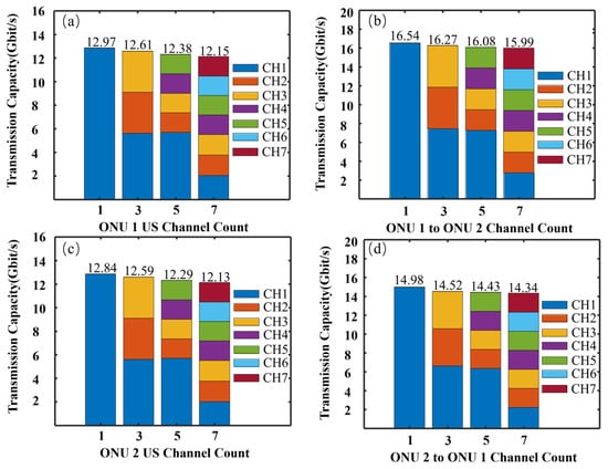 Utilizing the experimental setup presented in Section 4.1, the impact of upstream and inter-ONU channel count variations on maximum achievable upstream and inter-ONU transmission capacities was evaluated, and the results are presented in Figure 11. The received optical power for the upstream (inter-ONU) communications is fixed at −2 dBm (−7 dBm). In the figure, for each considered channel count of N (N = 1, 3, 5, and 7), the A and B signals of each ONU are used to convey N upstream channels and N independent inter-ONU channels, respectively.