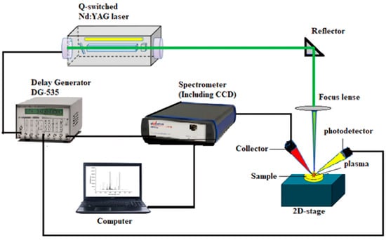 A powerful Q-switched Nd:YAG laser model Q smart 850 (Quantel, France) working at 10 Hz with the wavelength of 532 nm, at a pulse energy of 250 mJ and the laser pulse duration was about 5 ns. A biconvex lens of focal length 100 mm was used to focus the laser for generating laser plasma in the blood samples. The emission spectrum of plasma with a wavelength range of 190 nm to 770 nm is captured into a charge-coupled device (CCD) based optical fiber spectrometer (AvaSpec 2048, Avantes, Netherland) with a spectral resolution of 0.05 nm. A delay generator (Stanford model 535DG, Stanford, CA, USA) was used to modify the synchronization of the trigger pulse. The spectrometer triggering delay was configured to 1 µs, while the CCD integration duration was set at 2 ms. To avoid crater formation, a two-dimensional stage was used to precisely adjust the laser spot placement on the samples, leading to LIBS signal distortion. The experiment was conducted under ambient atmospheric conditions. An experimental setup of LIBS is shown in Figure 1.