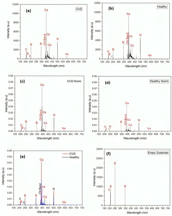 LIBS spectra of several atomic emission lines of (a) CVD and (b) healthy samples without normalized and with normalized spectra of (c) CVD and (d) healthy samples with (e) offset spectra of CVD and healthy once and the empty (f) substrate.