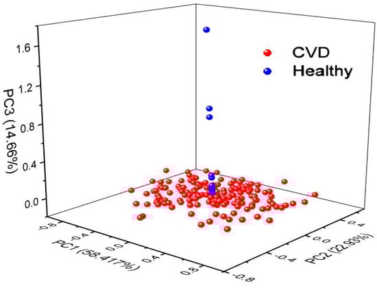 Principal component analysis (PCA) is an unsupervised machine learning process that applies to spectral data to decrease complexity and for discrimination between healthy and disease samples. PCA clustering results for healthy and CVD blood samples are shown in Figure 5. Most of the data variation was taken by the first three principal components, named as first principal component (PC1), second principal component (PC2) and third principal component (PC3). It showed a significant component of the total variance in the data set. It included 150 averaged spectra of each healthy and CVD sample. Precisely, PC1 accounted for 58.41% of the variance, PC2 for 22.93%, and PC3 for 14.66% cumulatively representing over 96% of the total data variance. The CVD samples showed better separation than the healthy samples in a dimensional dataset because data points were more spread out in each type of sample. In contrast, the data points in healthy samples were more compact due to the absence of serious malignancies. Still, there was a visible overlap between healthy and CVD clusters, which makes it difficult to categorize them.