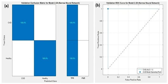 In Figure 6a for the validation dataset of CVD samples, 100.0% were correctly predicted as true positives and 0% were misclassified as false positives. Similarly, in Healthy samples, 100.0% were correctly predicted as true negatives and 0% were misclassified as false negatives. This gives sensitivity, which identifies diseased samples, also called the true positive rate. In this case, it is 100.0% and specificity, which identifies healthy samples, is also called the true negative rate. In this case, it is 100.0%. These results propose that the narrow NN model executes very well, particularly in identifying CVD and healthy cases with no false positives and negatives.