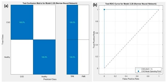 (a) Confusion matrix and (b) ROC curve of the Narrow NN formed by the testing model to differentiate CVD and healthy samples.