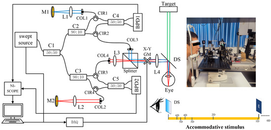 The infrared light from the swept-source is separated into two beams by coupler C1. These two beams form two sets of systems (SS-OCT-1, shown by the blue solid line and SS-OCT-2, shown by the red solid line), which can be transmitted coaxially but focused at different depths. Among them, SS-OCT-1 is used for anterior segment imaging. The sample light is reflected by the splitter to the X-Y galvanometer mirror, passes through the focusing objective lens L4 and the dichroiscope (DS), and finally focuses on the anterior surface of the lens. SS-OCT-2 is used for fundus imaging. The sample light passes through two lenses (L3, L4) into parallel light and then enters the pupil. In this process, it passes through the splitter and merges with the sample light of SS-OCT-1 to achieve coaxial transmission. Finally, it is reflected to the human eye by the dichroic mirror (DS) and focused near the retina with the help of the cornea and lens. The incident power of each sample arm is approximately 2 mW, complying with international standards (ANSI Z136.1/IEC 60825-1) [36,37]. The backscattered signal reflected by the human eye enters the corresponding fiber coupler and interferes with the corresponding reference light. The OCT interferograms were detected using two high-speed dual-balanced photodetectors (PDB480C-AC, 1.6 GHz bandwidth, Thorlabs Inc., Newton, NJ, USA) and a super data sampling digitizer card (National Instruments PXIe-5162, 5 GHz sampling rate, National Instruments, Austin, TX, USA). A high-speed oscilloscope card with two channels was used for data acquisition. The sensitivity of each channel in the system is approximately 92 dB. Finally, the two images are stitched together to obtain a full-eye image. To ensure the stitched image reflects the true axial length, we first calibrated the system using a model eye before performing measurements on real human eyes. Accommodative stimuli from 0 D to 6 D were generated using a 1.5-mm-high letter ‘E’ as a visual target mounted on a fixation board. The target was secured to a sliding rail aligned parallel to the subject’s visual axis. Human eyes gazing at a distant target through DS enables the ciliary muscle to relax to the greatest extent and avoid the interference caused by lens adjustment. The focal length of lens L3 and L4 is 100 mm, which can achieve a lateral resolution of 32 μm.
