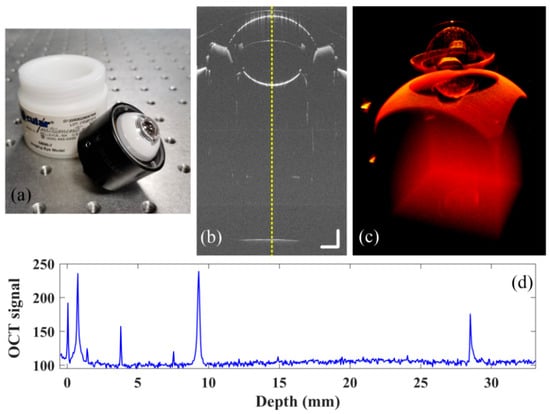 Model eye imaging results obtained by dual-focus SS-OCT. (a) Physical image of the model eye; (b) B-scan image at visual axis; (c) 3D image of the model eye; (d) A-scan signal intensity at the position of the yellow dashed line in (b). The white scale is 2 mm.