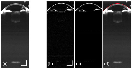 Next, we measured the left eye of five subjects. All subjects are the authors of this article. During the experiments, we collected complete 3D OCT data and selected the B-scan images closest to the eye’s optical center for refractive power measurements. For each accommodative stimulus, 50 ocular images were acquired. The 20 most similar images were averaged to generate a new image, which was used for ocular parameter calculation. Figure 3a shows one of the full-eye images obtained by the dual-focus SS-OCT system. In order to perform refraction correction on the whole eye image, we first extracted the boundary of the front surfaces of the cornea. A gradient template ([1, 1, −1, −1] and [−1, −1, 1, 1]) was applied to enhance the ocular surface boundary (Figure 3b). Although the anterior corneal surface is clearly visible, due to the presence of eyelashes, some interference information will appear above it. A method of removing outliers was used to eliminate isolated interference signals, as shown in Figure 3c. Then, the “improved Canny operator” method was applied to the detected boundaries for precise identification and extraction of the contours from Figure 3c. Finally, quartic polynomial fitting is performed on discrete coordinates using the least squares method, and the fitted curve was marked with a solid red line. The final result is shown in Figure 3d.